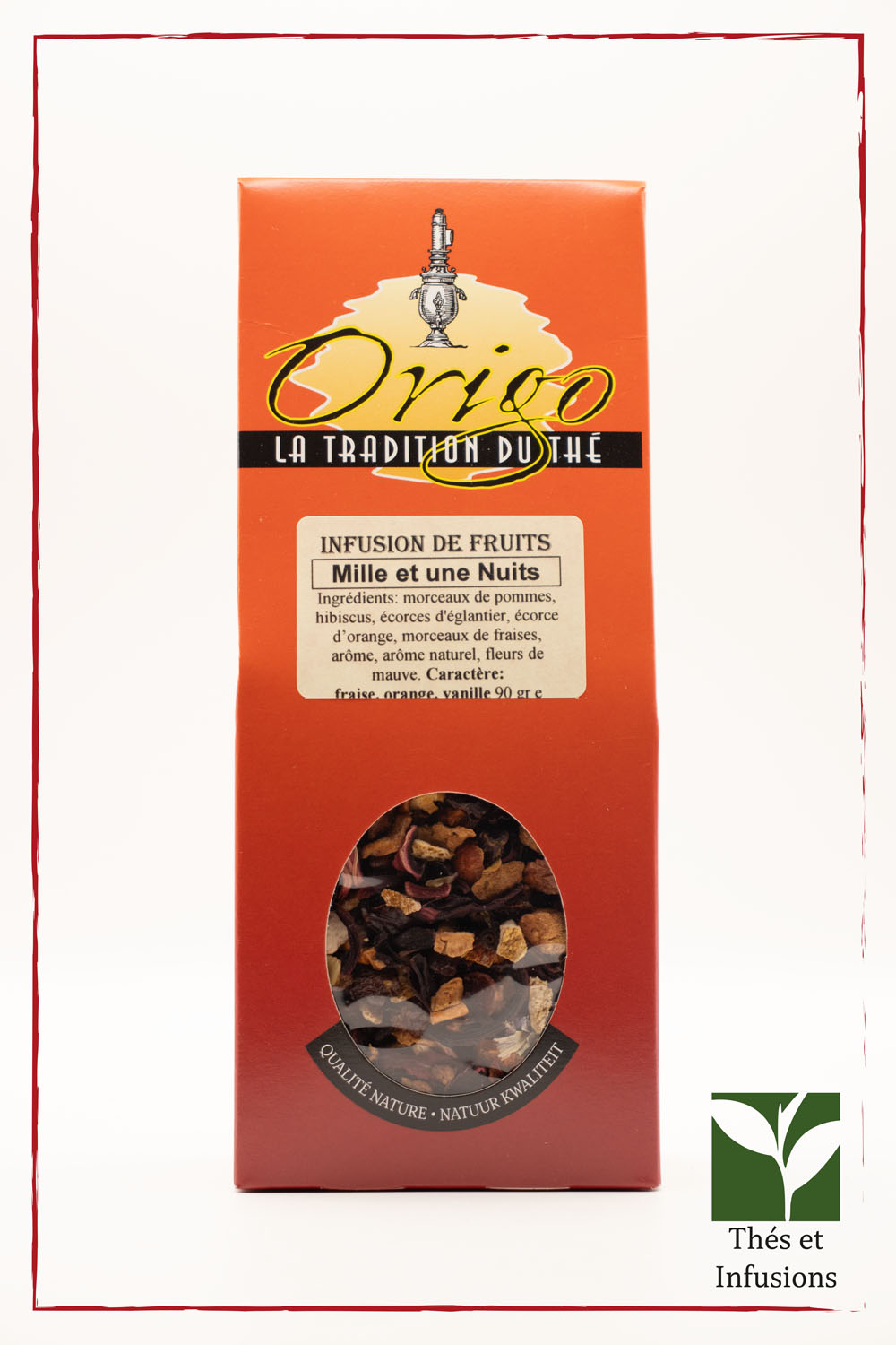 Ingrédients: morceaux de pommes, hibiscus, écorces et graines d’églantier, écorces d’orange , arôme, morceaux de fraises lyophilisées, Extrait d’arôme, fleurs de mauve